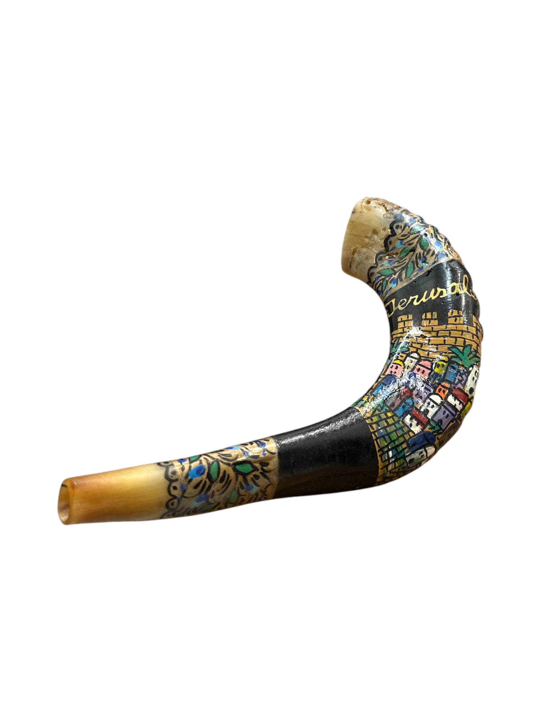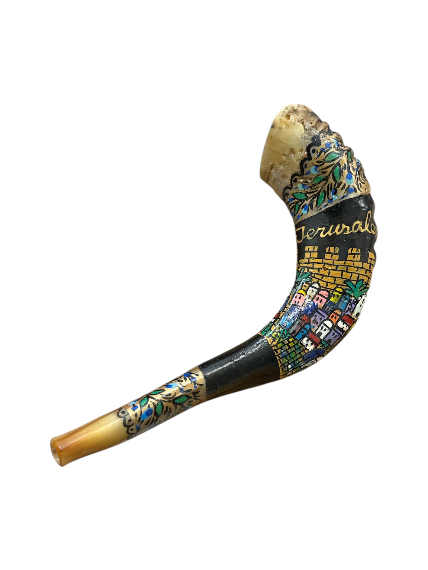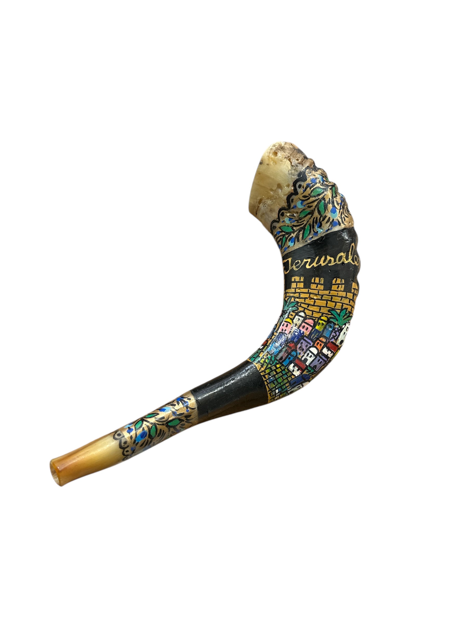 Experience Vibrant Sacred Artistry Treasure this extraordinary ram's horn shofar featuring a meticulously hand-painted colorful Jerusalem cityscape with golden "Jerusalem" text, creating a joyful ceremonial instrument that celebrates the Holy City in vivid detail.